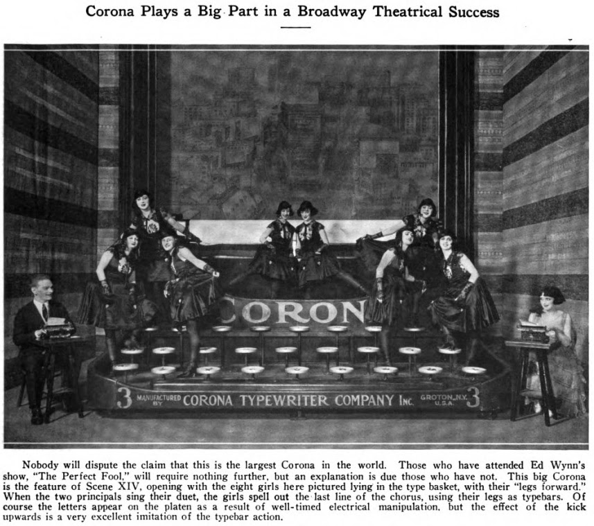 March 17, 2021 Writing Corona Typewriter on Broadway, 1922 Posted by Book Doctor Dara This post has an image of a large Corona typewriter on Broadway show Ed Wynn’s The Perfect Fool (1922). Share this: Click to share on Facebook (Opens in new window) Facebook Click to share on X (Opens in new window) X Click to share on LinkedIn (Opens in new window) LinkedIn Click to share on Pinterest (Opens in new window) Pinterest Like Loading... Related