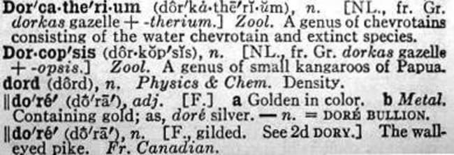 The 1934 edition of Webster’s New International Dictionary defined “dord” as meaning density (they meant to write “D or d” as a scientific abbreviation for the word density). But the editor misread the notation as “dord” and included it as a separate word, between “Dorcopsis” and “doré.”he mistake was discovered in 1939. Five years of a word that wasn’t a word!