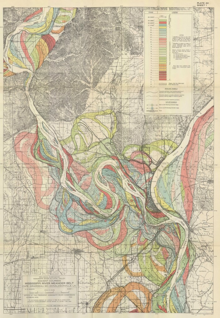 This is a map of the Mississippi River, created in 1944 by a cartographer named Harold Fisk.