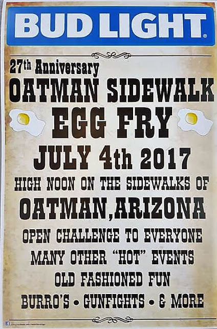 If you travel 45 minutes southwest of Interstate 40 town of Kingman to Oatman, Arizona, whose population is 135, they have a Sidewalk Egg Frying Contest every Fourth of July since 1991, at high noon on the sidewalk of this old mining town off Route 66. Contestants have 15 minutes to cook their eggs, and they have some very odd and cool contraptions.