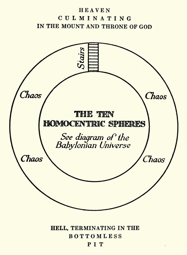 3: A representation of the Babylonian Universe with upper hemispheres cut away to show the interior. The upright line is the polar axis of the heavens and earth. The two seven-staged pyramids represent the earth, the upper being the realm of the living, the under one the abode of the dead.